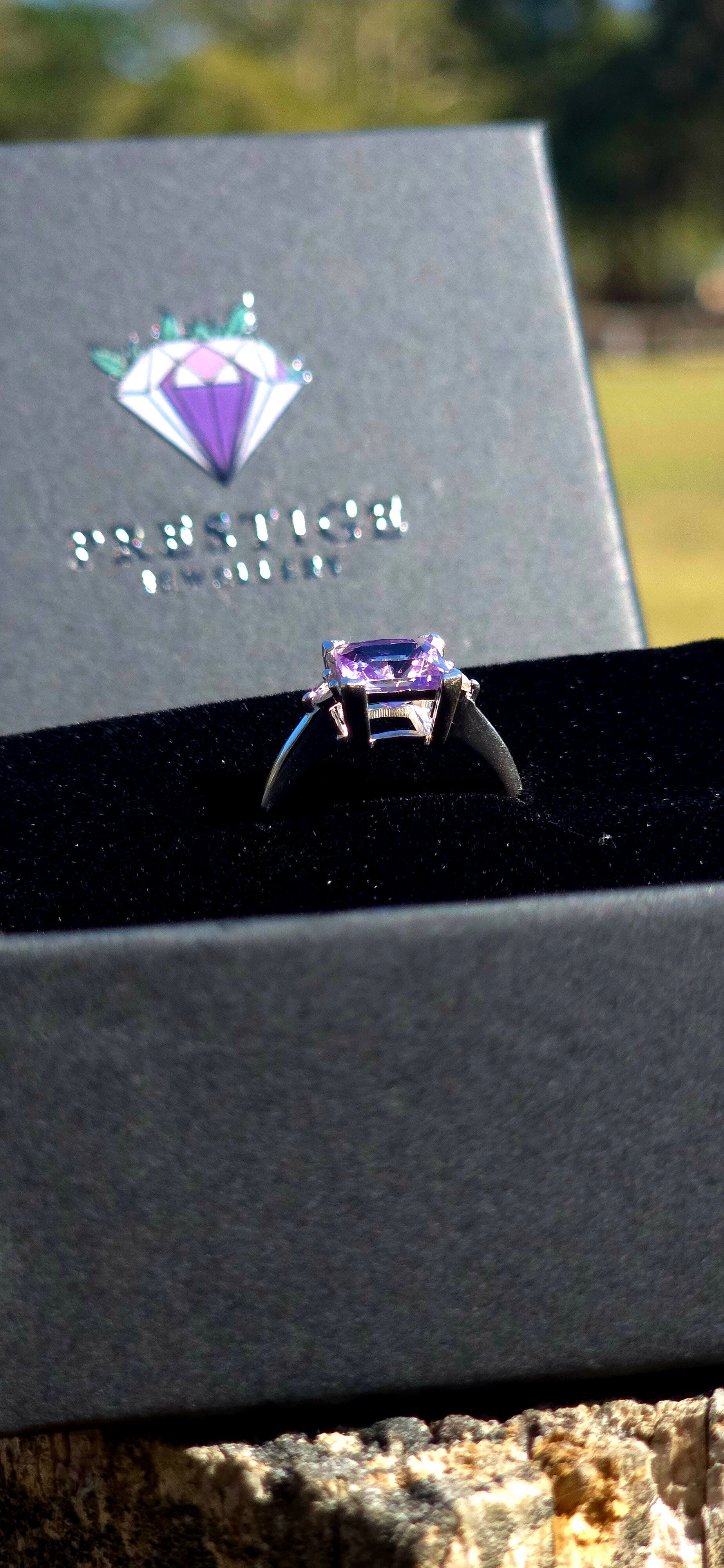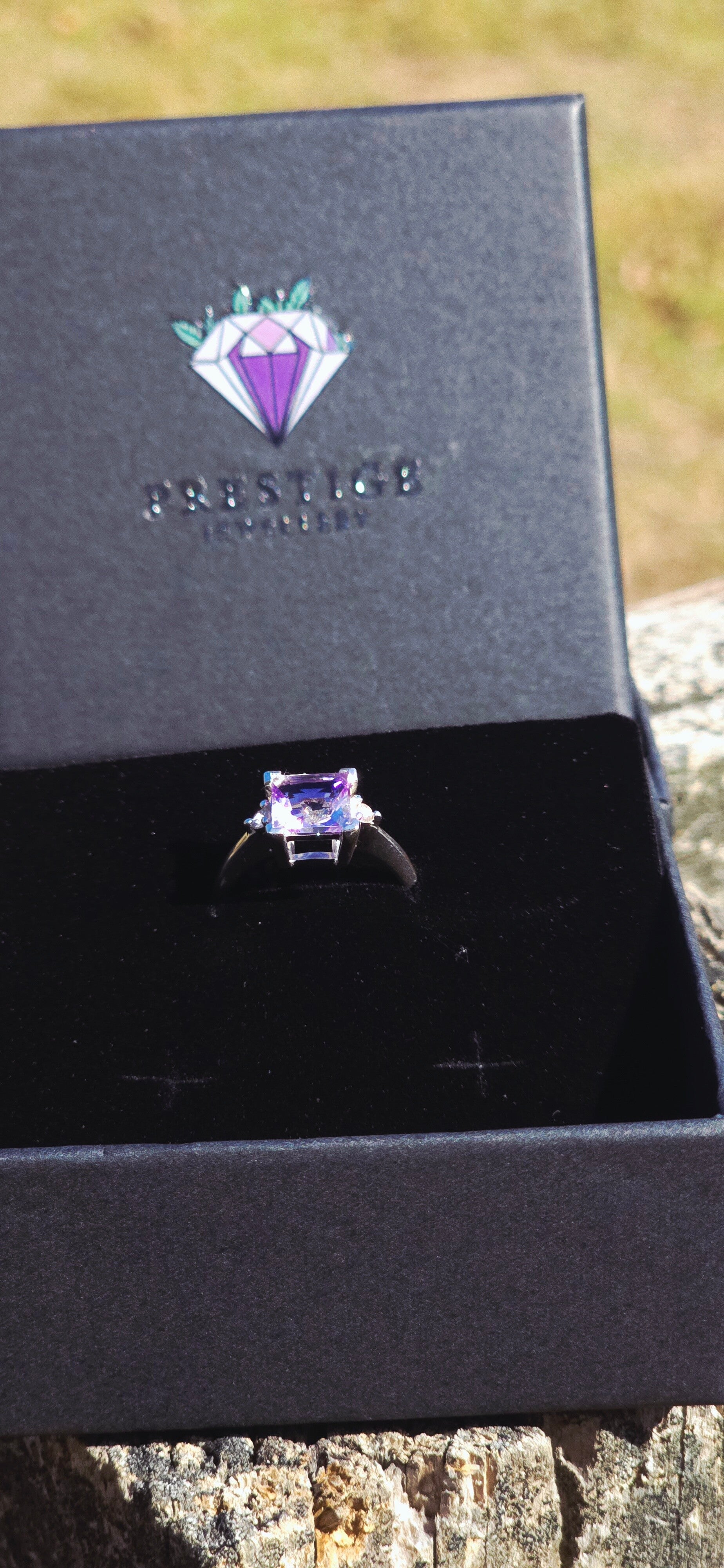 Amethyst, a symbol of clarity and tranquility, is beautifully offset by the intense fire and sparkle of the White Zircon. This combination creates a harmonious balance of vibrant color and brilliant light, resulting in a versatile and stunning piece suitable for any occasion.